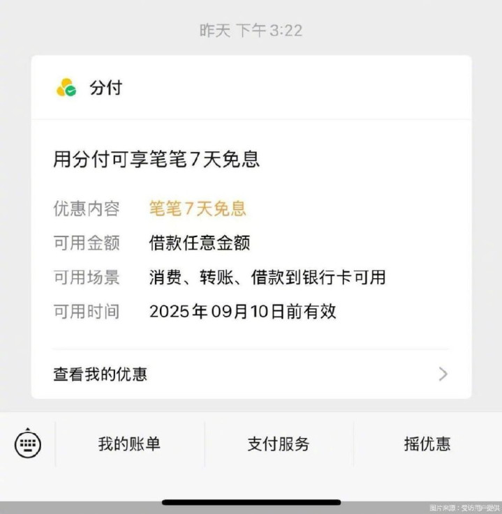 除了上线借款功能外,北京商报记者采访了解到,近期微信还对部分使用“分付”的消费者发放了7天免息优惠。“我在8月12日在微信中收到推送内容,提示使用‘分付’可享笔笔7天免息,有效期至9月10日。”有用户表示。